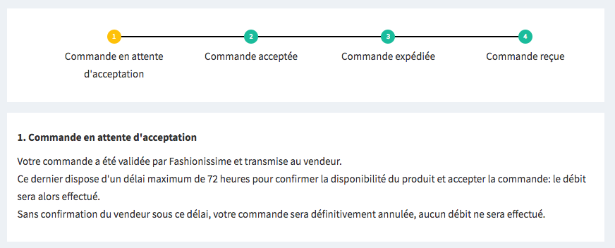 Sur votre marketplace, utilisez donc un langage clair qui sera compris des acheteurs et proposer une interface de suivi des commandes avec une explication de chaque étape.