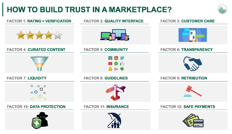 Comme illustré ci-dessus, la confiance est un pilier qui varie en fonction du type de biens ou des services qui s’échange sur votre marketplace. Vous mettrez naturellement plus d’effort sur ce point si votre marketplace propose des services de garde d’enfant que si vous êtes spécialisé dans la vente de livres.
